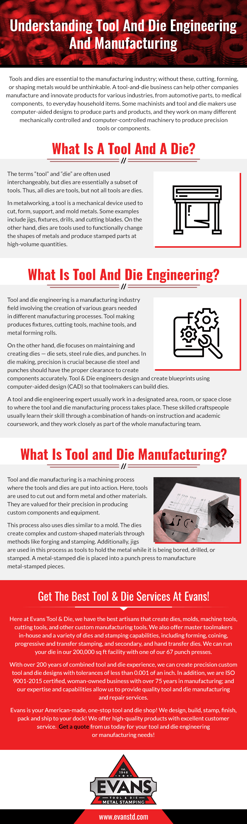 Tools and dies are essential to the manufacturing industry; without these, cutting, forming, or shaping metals would be unthinkable. A tool-and-die business can help other companies manufacture and innovate products for various industries, from automotive parts, to medical components, to everyday household items. Some machinists and tool and die makers use computer-aided designs to produce parts and products, and they work on many different mechanically controlled and computer-controlled machinery to produce precision tools or components.