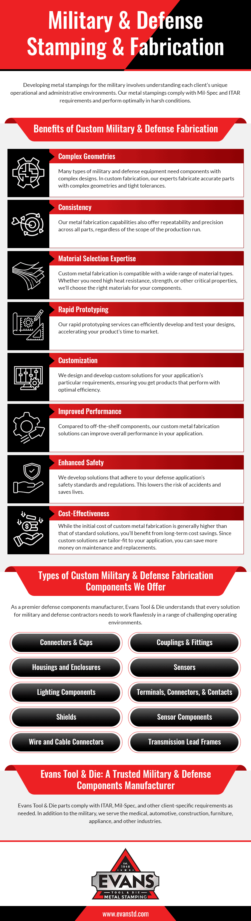 As a metal stamping parts manufacturer, Evans Tool & Die has the equipment and expertise to produce defect-free, cost-effective components for military and defense contractors. Our parts comply with ITAR, Mil-Spec, and other client-specific requirements as needed. In addition to the military, we serve the medical, automotive, construction, furniture, appliance, and other industries.